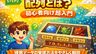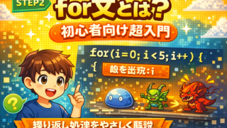 はじめに|同じ処理を何度も書くのは大変ゲームを作っていると、こんな場面が必ず出てきます。敵を10体出したい弾をたくさん動かしたいスコア表示を毎フレーム更新したいもしこれを全部手作業で書くとしたら、とても大変です。そこで登場するのがfor文(...